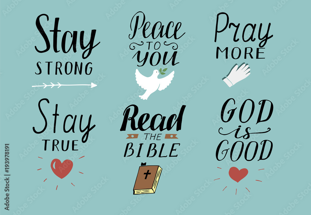 Set Of 6 Hand Lettering Christian Quotes With Symbols Stay Strong Peace To You Pray More Read The Bible God Is Good Stock Vector Adobe Stock